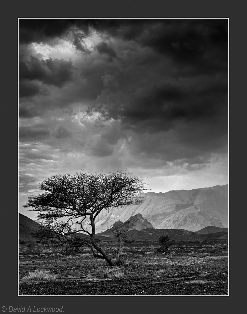 Gorgeous drama in the sky with that storm lingering overhead. Perfect composition with that tree silhouetted against the mountains and the rocky background. I really love your black and white work. But then I could be biased š