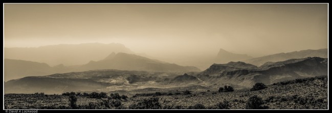 A panorama taken one misty day from Jebel Shams en route Jebel Misht.
