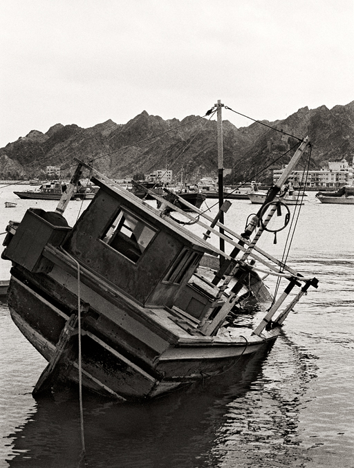 Visiting Muscat harbour anchorage at the entrance to a bay overlooked by the Sultan of Oman’s Muscat palace; there has been a tradition for ships crew to paint the name of their vessel on the rocks surrounding this bay.